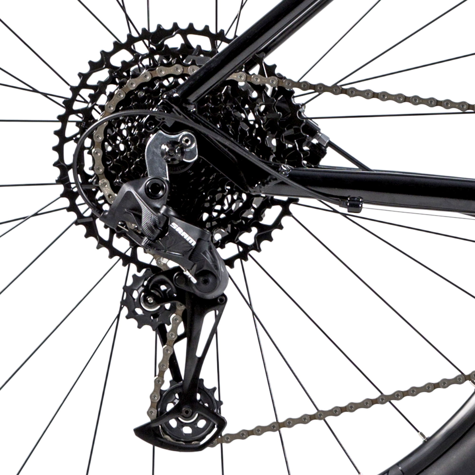 Transmissão 100% Sram com câmbio traseiro SX Eagle de 12 velocidades, cassete e corrente da mesma linha, e pedivela SX Eagle DUB com 32 dentes e braço de acordo com o tamanho do quadro, para melhor adaptação do atleta sob a bike.